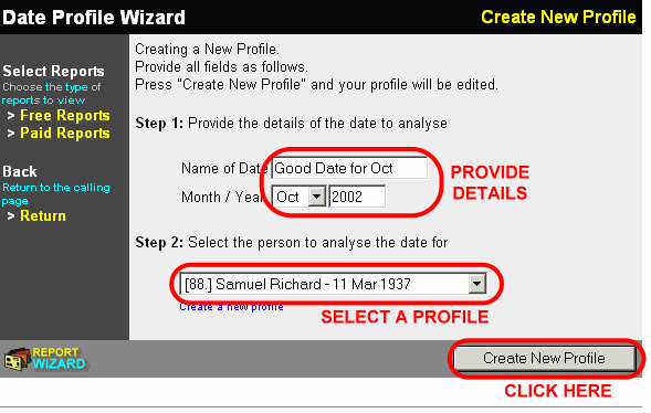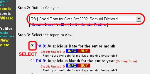 • Click on the Auspicious Date link, which opens up a Report Wizard on the right frame.